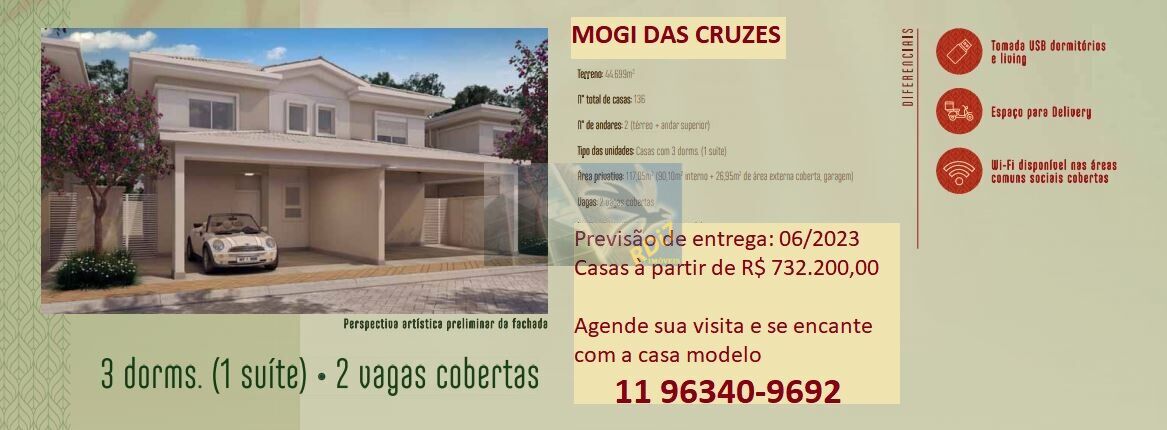 Um condomínio de casas em um dos terrenos mais desejados de Mogi das Cruzes. Seus dias vão encontrar os melhores momentos da sua família, em um conceito residencial que reúne ruas tranquilas e paisagismo encantador, com a casa no estilo que você sempre imaginou ter.